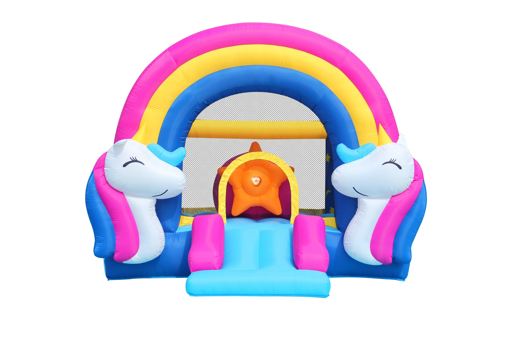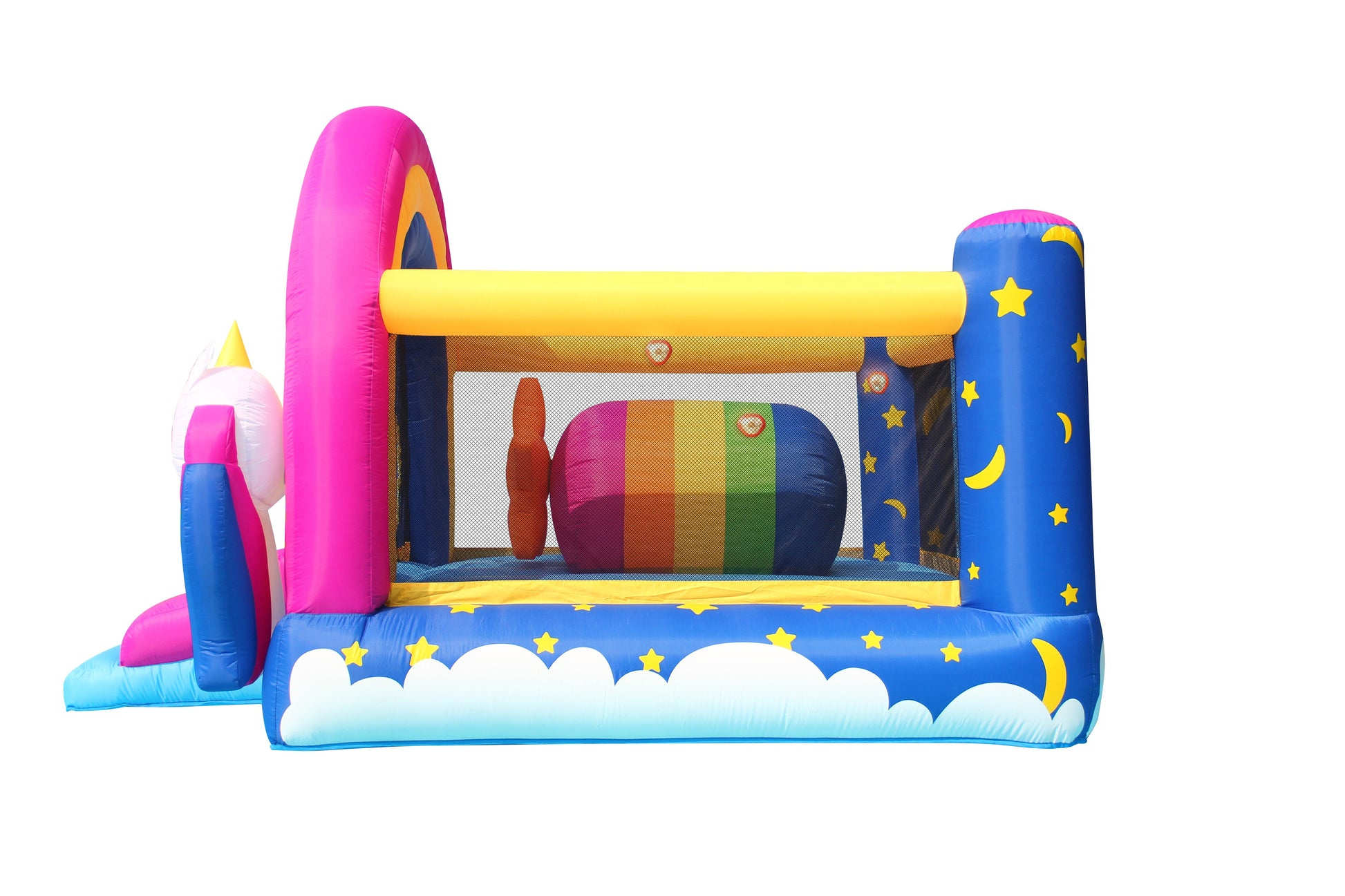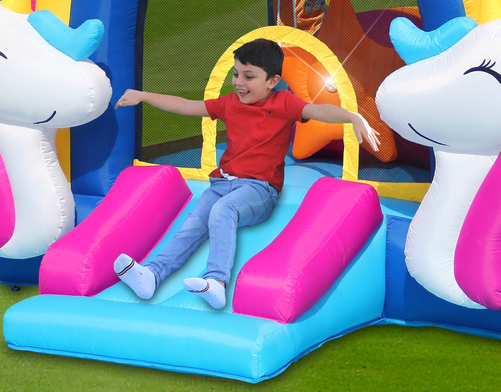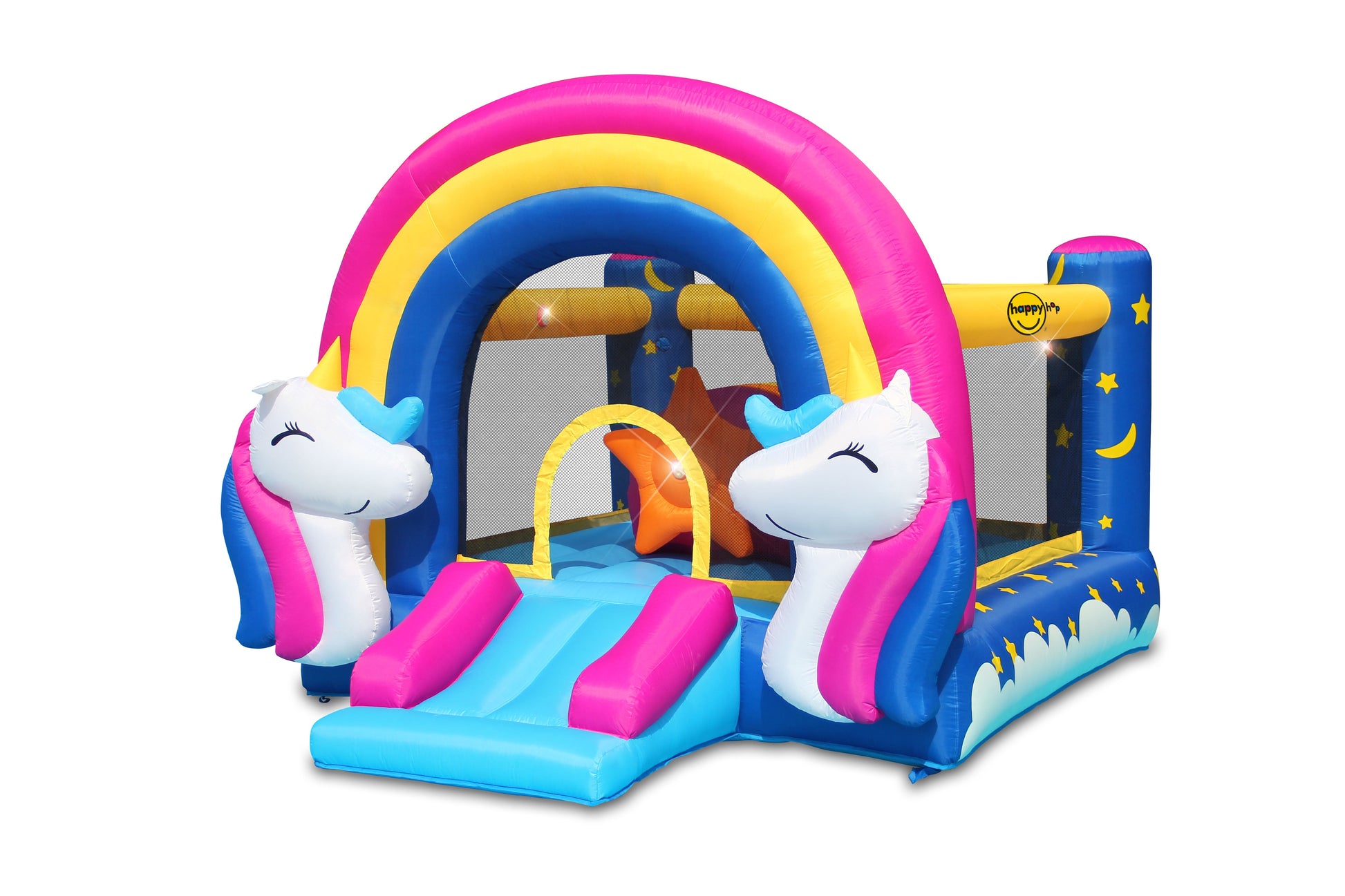 The Happy Hop Unicorn HIT ME bouncer has a unicorn design to make any party feel magical. The enclosure net creates a safe bouncer for kids. Interactive buttons are placed around the bouncer to enhance their surroundings with light and...