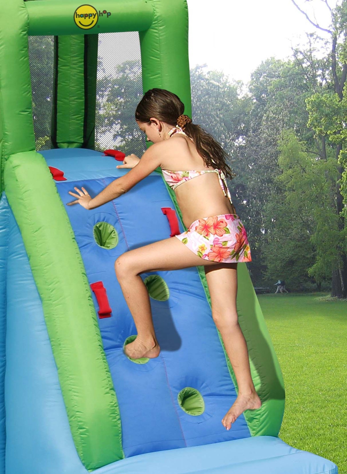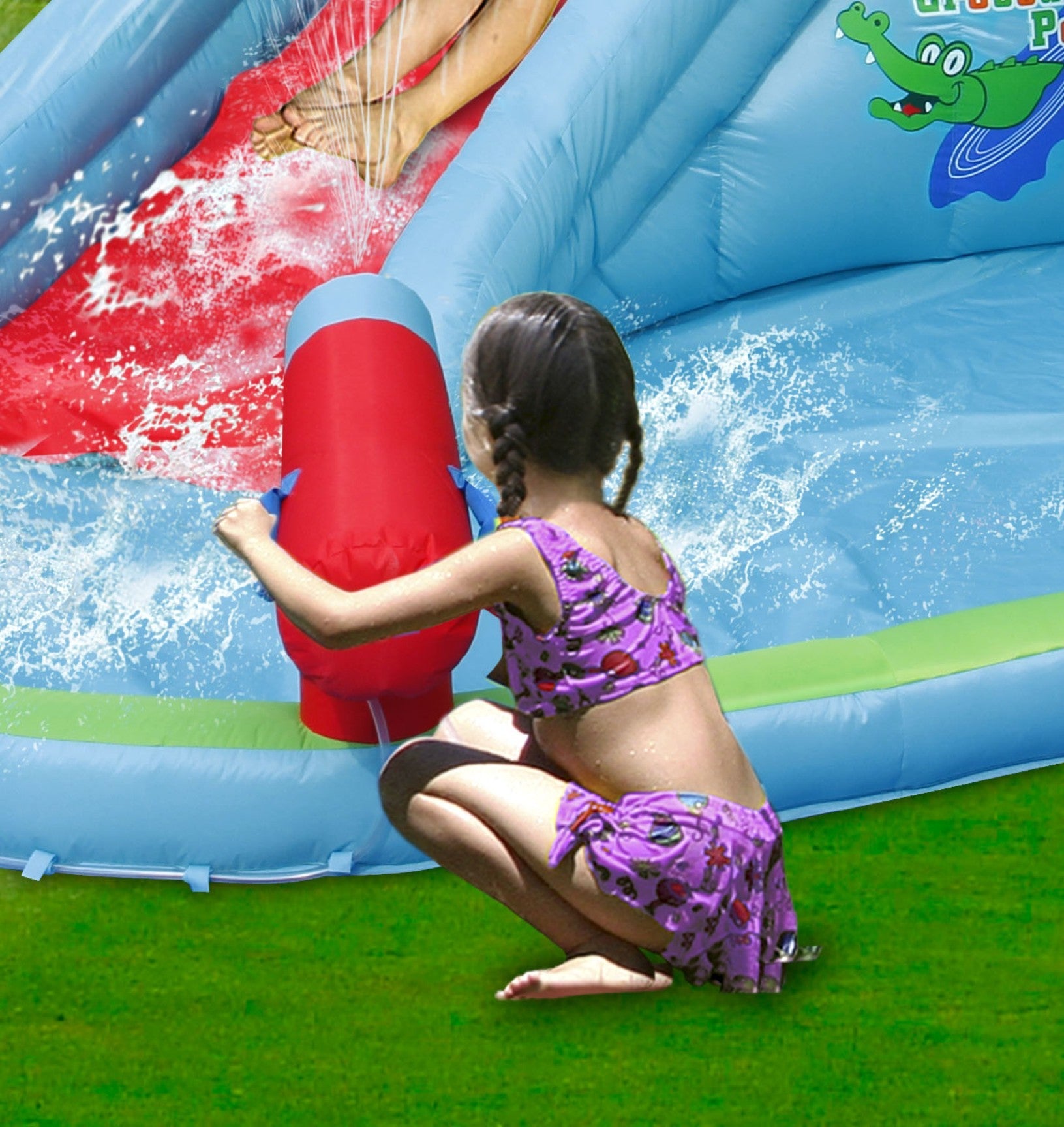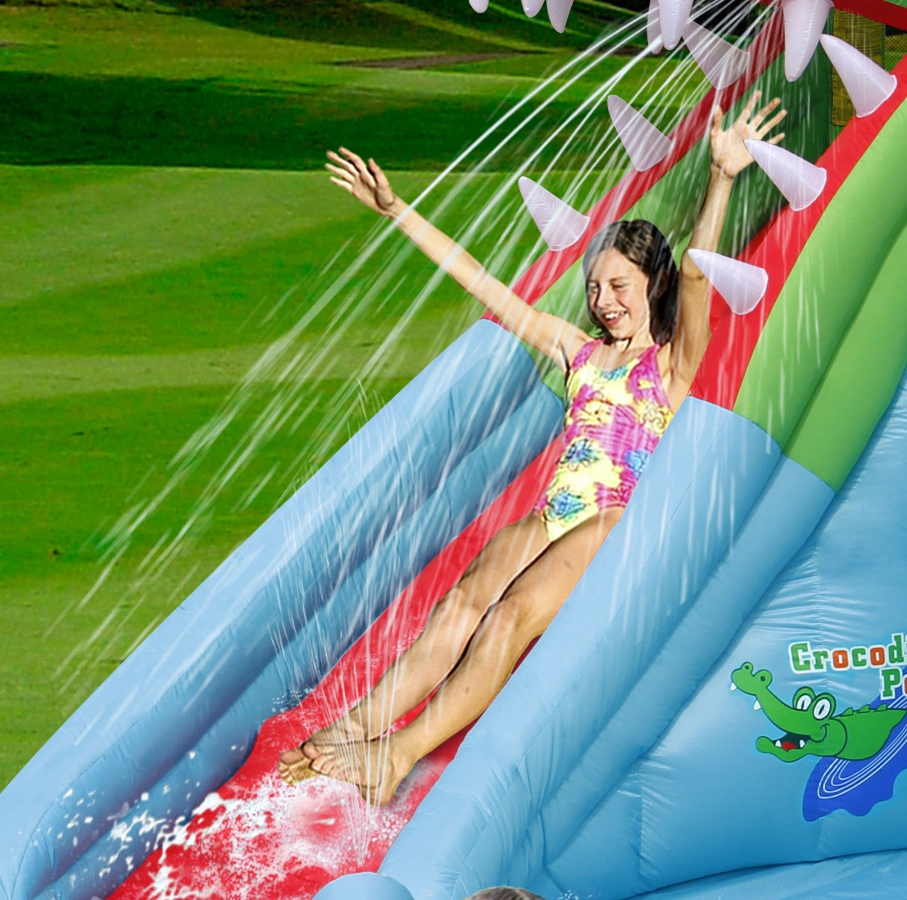 This Happy Hop Crocodile Pool is an awesome adventure and experience in the hot summer days. Equipped with tons of new features like our Water gun blaster, water slide, mini pool and rock-climbing feature. This inflatable crocodile pool is tons...