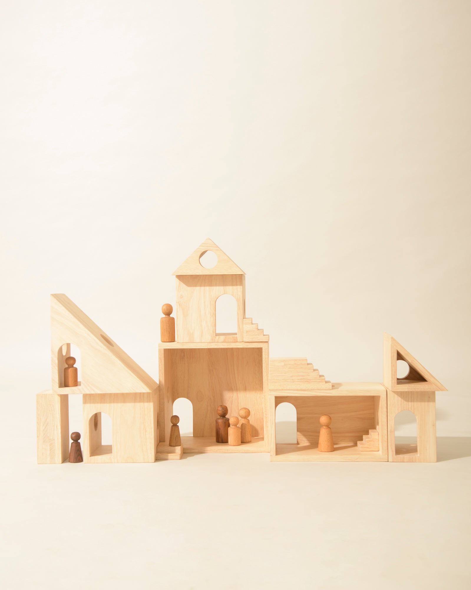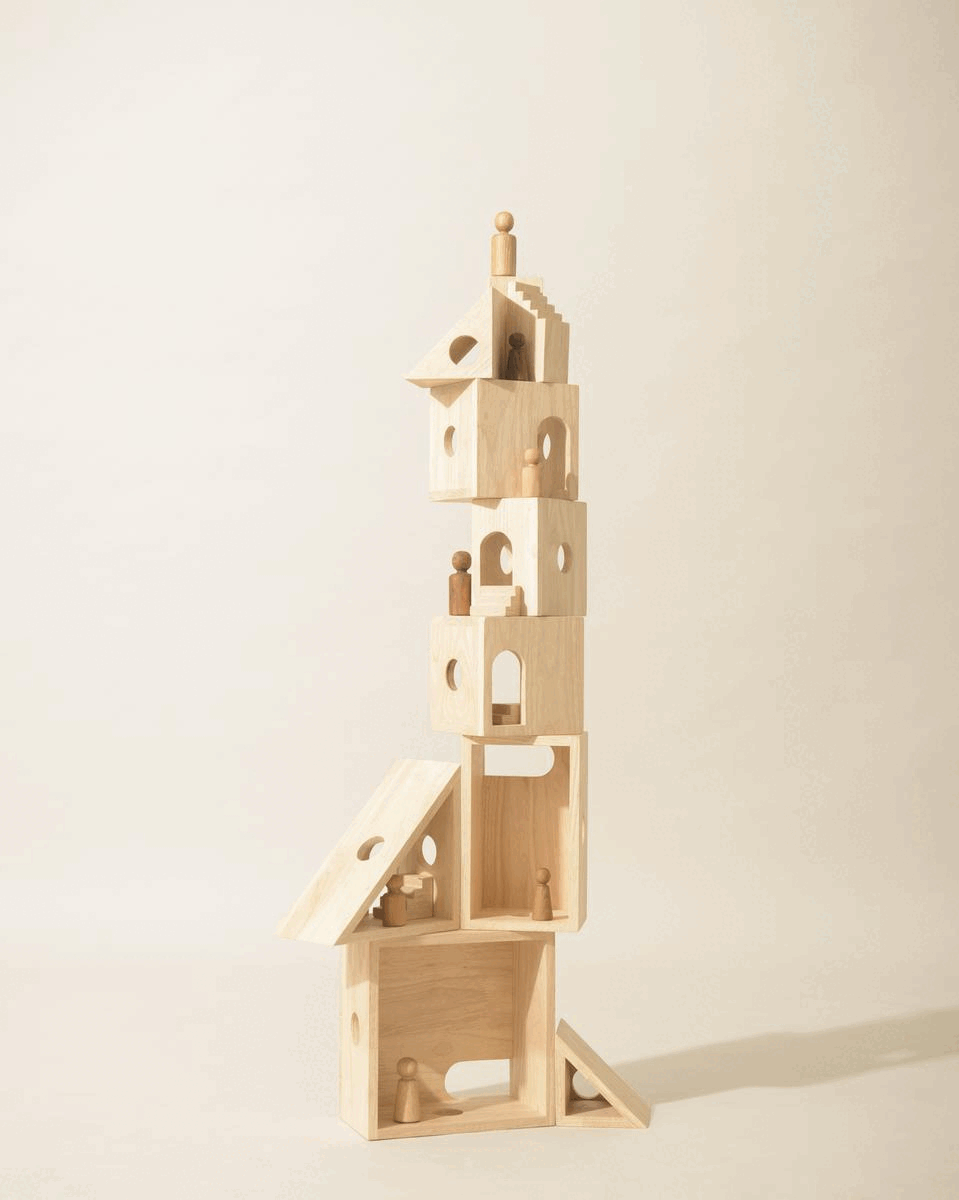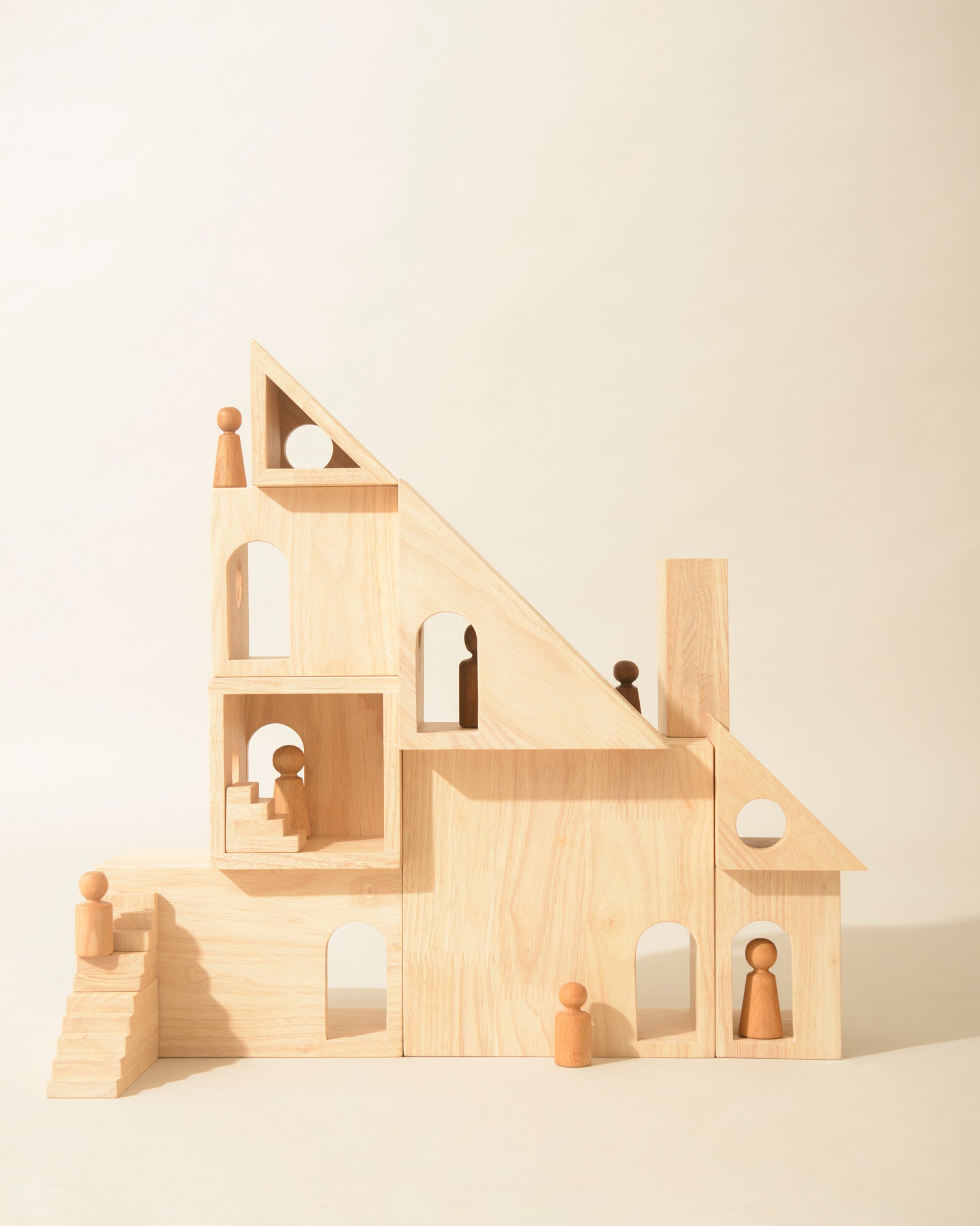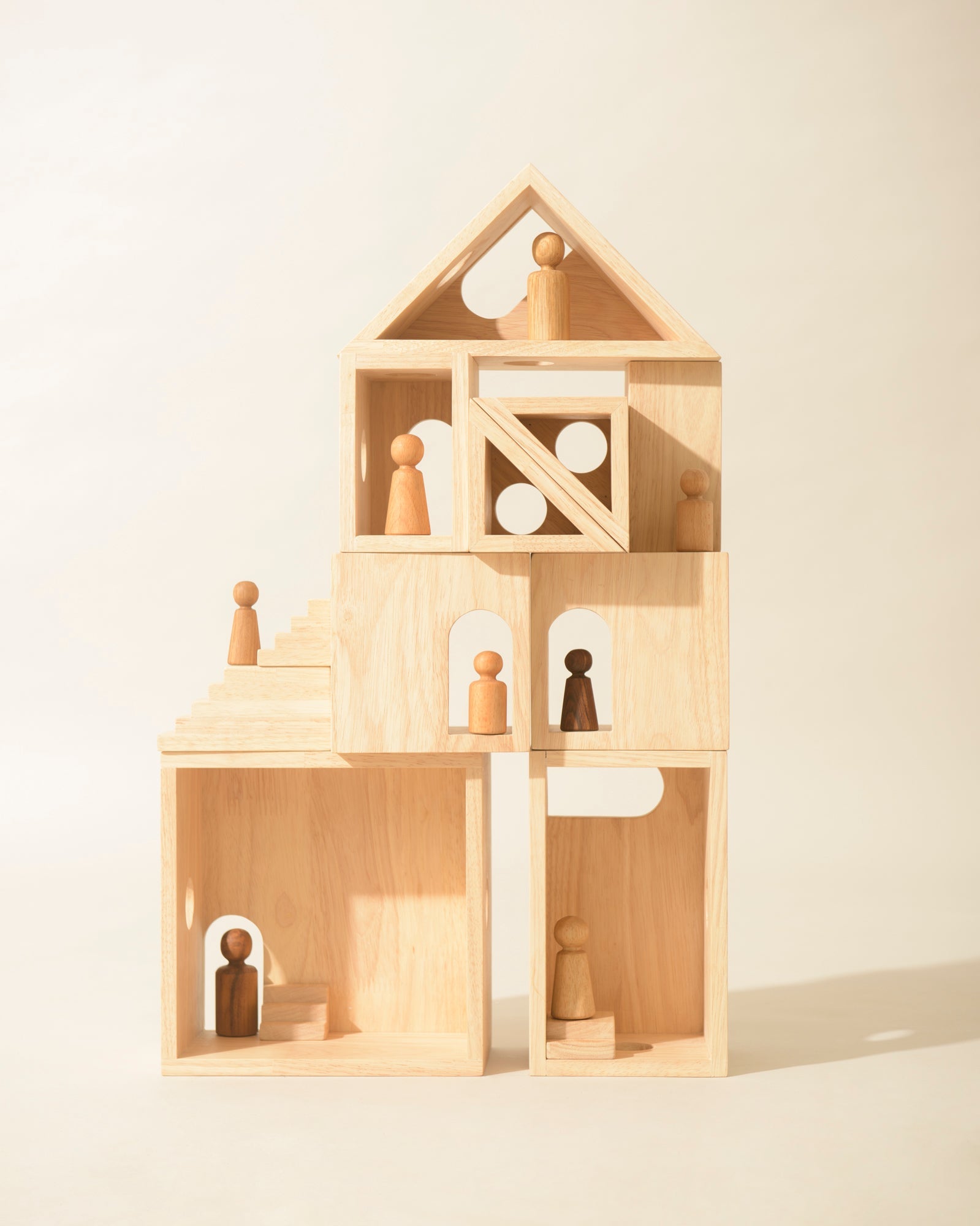 A wooden doll house that is modular, stackable, re-arrangeable and infinitely reconfigurable to make many different kinds of homes - an apartment building, an independent house, a row house, a duplex... a castle! Handmade with rubber wood, and finished with mouth-safe finishes,...